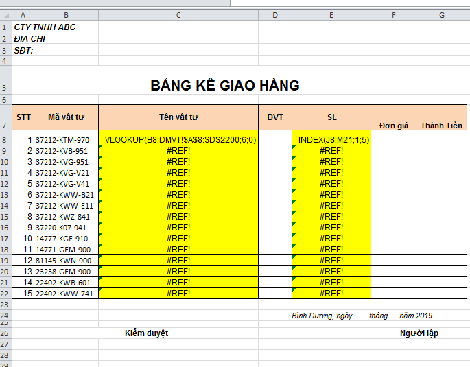Trong ví dụ sau đây, =VLOOKUP(B8;DMVT!$A$8:$D$2200;6;0) sẽ trả về lỗi #REF! vì công thức này đang tìm kiếm giá trị để trả về từ cột 6 nhưng dải ô tham chiếu lại là A:D, chỉ là 4 cột.