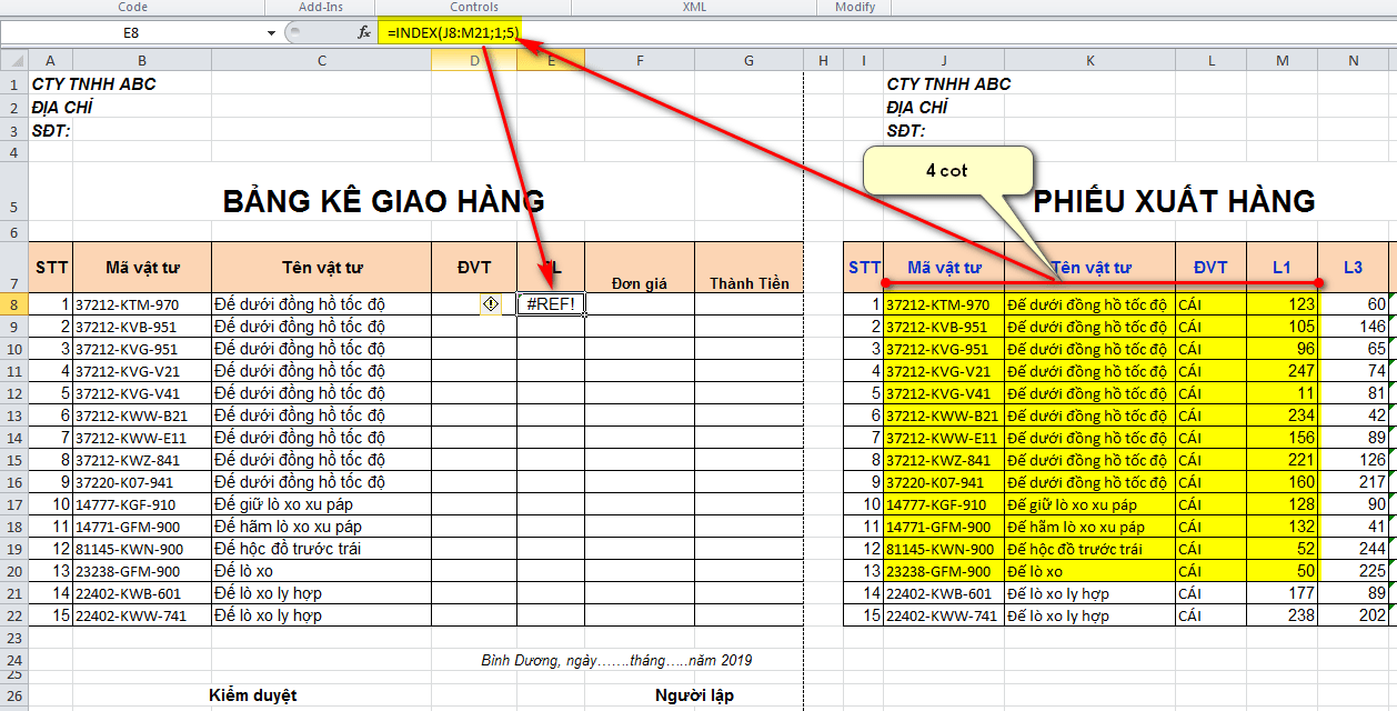 Công thức sử dụng tham chiếu ô rõ ràng như =O8+N8+M8 có thể gây ra lỗi #REF! nếu một cột bị xóa, chẳng hạn bạn xóa bỏ cột O, N hoặc M nó sẽ gây ra lỗi #REF!. Tôi sẽ xóa bỏ cột N (L2), và công thức trả về =N8+#REF!+M8.